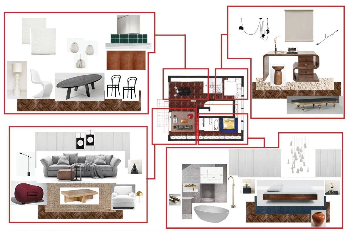 LIVING ROOM: grey sofa by Carlo Colombo for Flexform, red chair by Boule Jean Royere, white chair FR91 by Jean Michel Frank| BATHROOM: bathtub by Meuller Australia, floor tap by Meir Australia, small tap by Meir Australia | MASTER BEDROOM: custom made large white closet, custom made blue rug, bed by Formstelle for Zeitraum | SECOND BEDROOM: walnut desk by Kare Design, stool by Monic Foster for Zanat, rug by Ikea, vintage daybed, custom made roller blinds | KITCHEN: Panton chair by Vitra, chairs Fameg Vienna Thonet no. 18, custom made dining table
